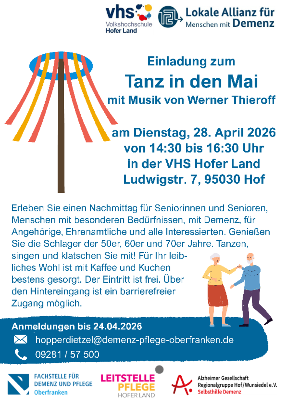 Die Lokale Allianz für Menschen mit Demenz im Hofer Land lädt ein zum Tanz in den Mai am Dienstag, 28. April 2026, von 14.30 bis 16.30 Uhr in der VHS Hofer Land, Ludwigstr. 7 in Hof.