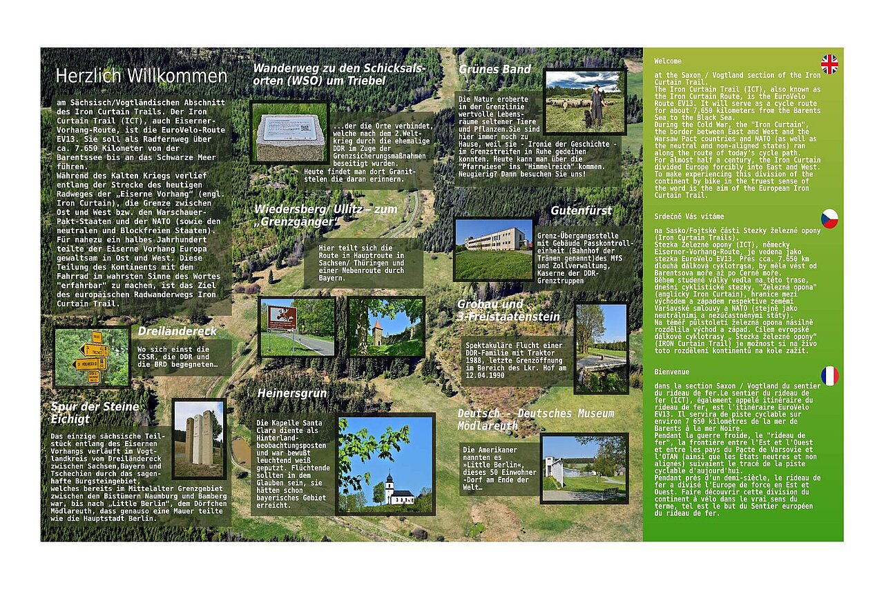 Im Vogtland verläuft die Hauptroute des Iron Curtain Trail auf der sächsischen Seite, während eine Alternative (EuroVelo 13a) auf der bayerischen Seite führt. Die Strecke verbindet das Dreiländereck Bayern–Sachsen–Böhmen bei Prex mit dem Deutsch-Deutschen Museum in Mödlareuth. Entlang des Weges erinnern historische Gebäude wie ehemalige Wachtürme sowie Informationstafeln an Fluchtversuche und zwangsumgesiedelte Ortschaften – eine eindrucksvolle Geschichte der Teilung Deutschlands und Europas. Zugleich führt der Trail durch einzigartige Fauna und Flora; jahrzehntelang unberührte Grenzlandschaften laden zum Entdecken ein.